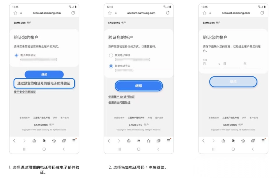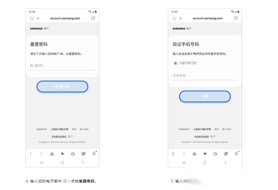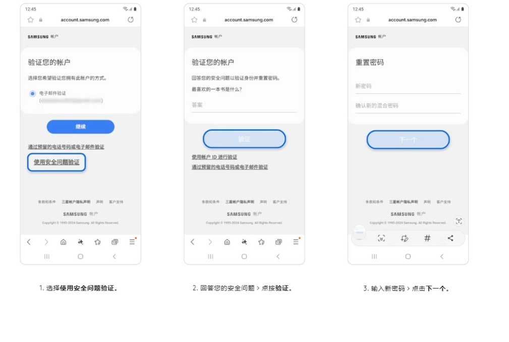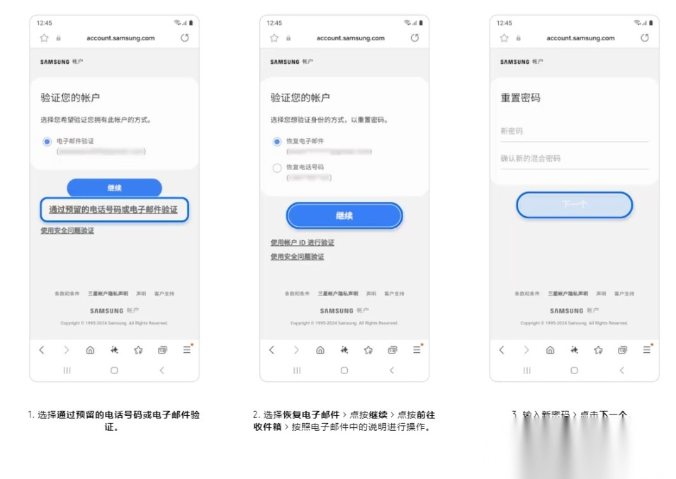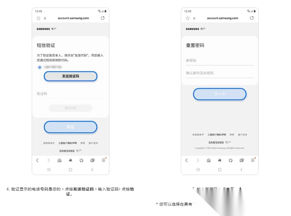 电话号码重置密码,您需事先在三星账号的设置里完成辅助