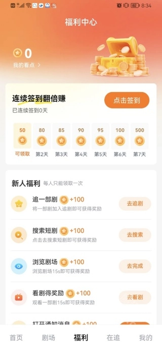 3、进入福利页面,在这里可以进行点击签到,还有新人福利任务可以完成;