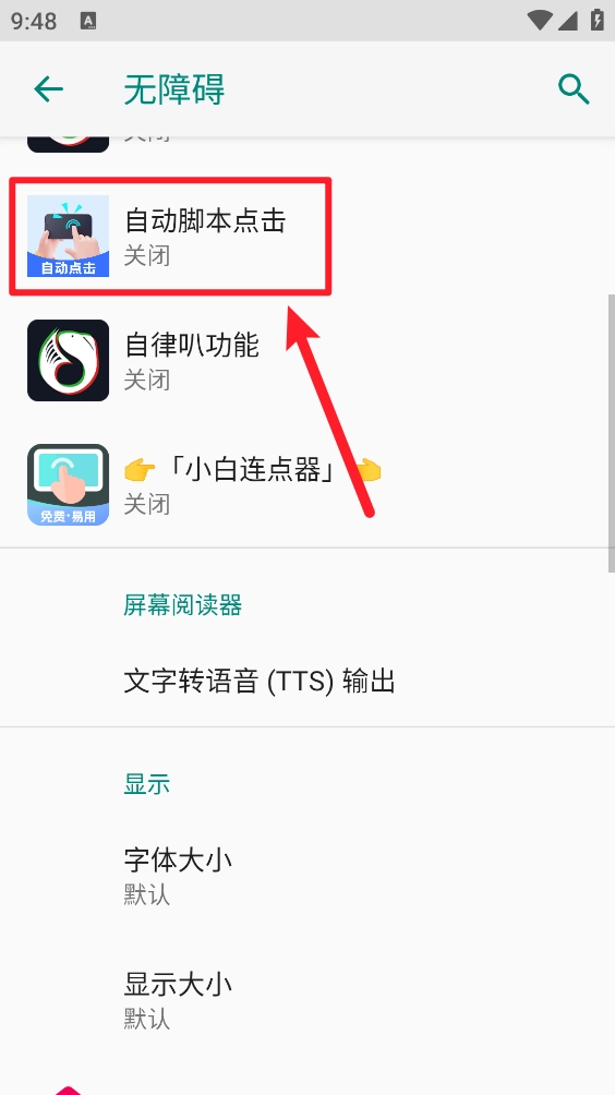 3、自动跳转至无障碍页面打开"自动脚本点击"。