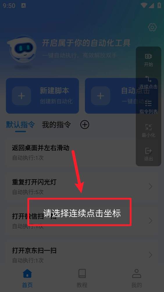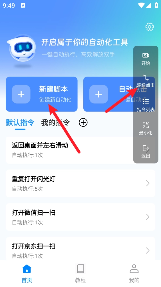 5、回到主页后创建新脚本,如图所示,选择“连续点击”选项。