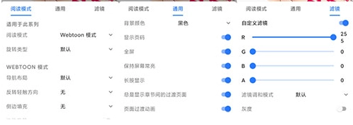 6、除此之外,无论是看漫画时的翻页模式、保持长亮、明暗主题、滤镜等等这些可选项,还是双击屏幕局部放大的小设计,让人看漫画的体验感急剧上升。