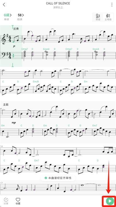 4、打开谱子后,点击右下角的播放即可开始学习使用。
