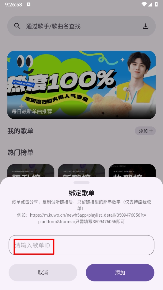 2、如图所示,输入歌单id后点击“添加”按钮即可完成操作。若要获取歌单id,可点击歌单的分享功能,复制试听链接后,提取链接中包含的那串数字即可(该操作仅支持酷我歌单)。