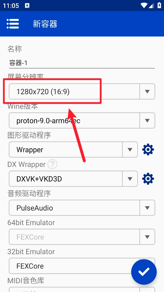 3、创建容器时,将自定义分辨率调整为与手机分辨率一致,即可实现全屏显示。