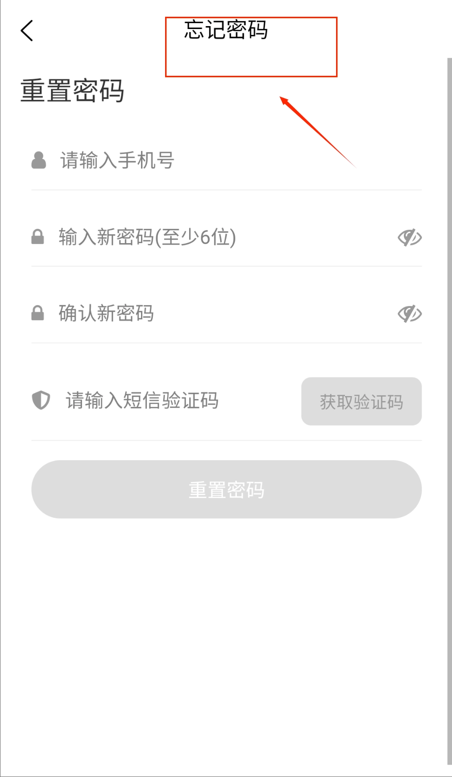 忘记密码无需担心,只需在登录页面点击蓝色的“忘记密码?”按钮,即可跳转到重置页面。接着输入注册时使用的手机号,点击“获取验证码”,然后将收到的短信验证码与新设置的密码依次填写好就可以啦。
