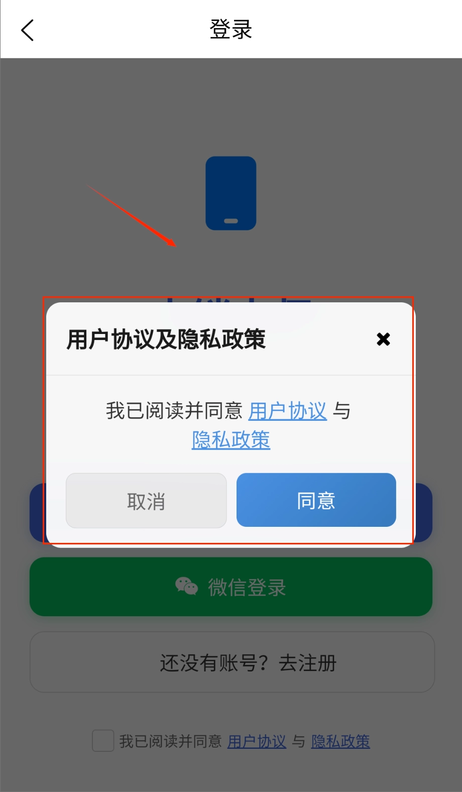 遇到协议弹窗时要多留意,每次登录前都会弹出蓝底的“用户协议及隐私政策”窗口,需要勾选“我已阅读并同意”的小方框才行。