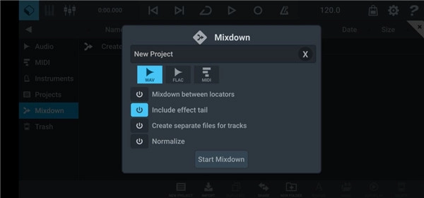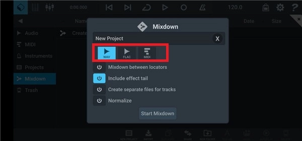 然后点击左上角,在mixdown选项中选择最上方的create mixdown功能。