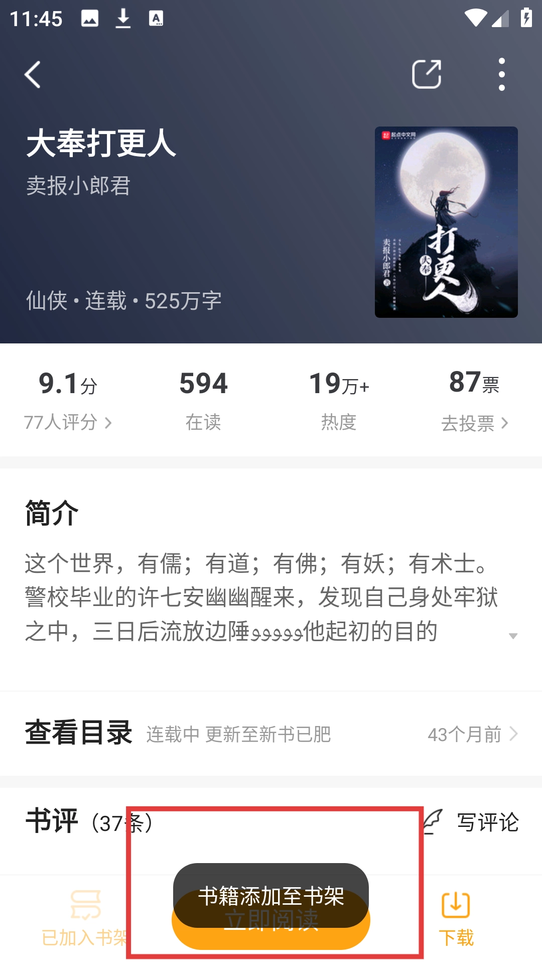 在书城页面,挑选自己钟爱的小说,像《大奉打更人》这类,点击就能进入小说详情页面,接下来就可以把它添加到书架里了。