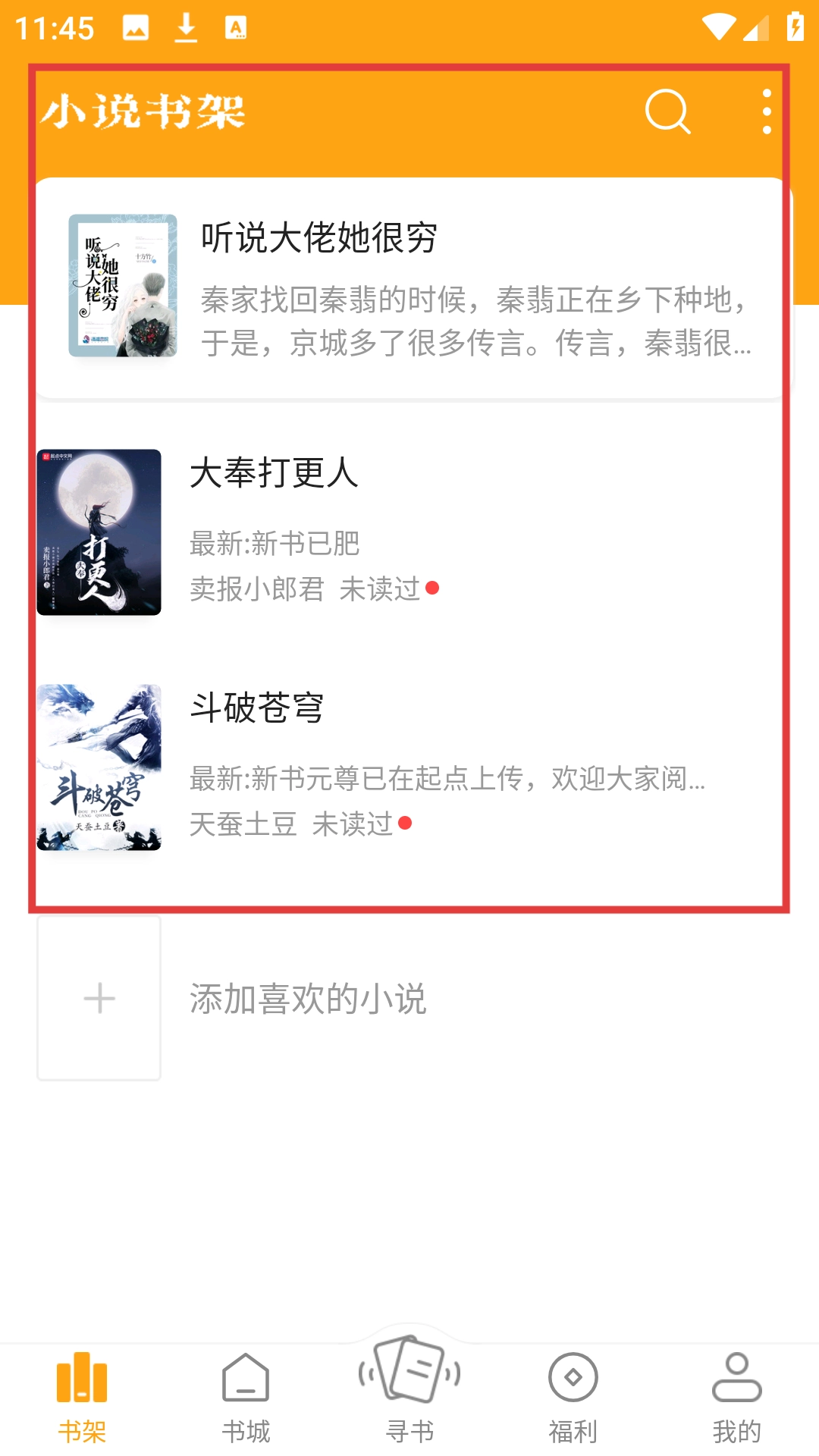 进入书架页面,就能看到已添加的《大奉打更人》等小说,方便后续随时阅读。