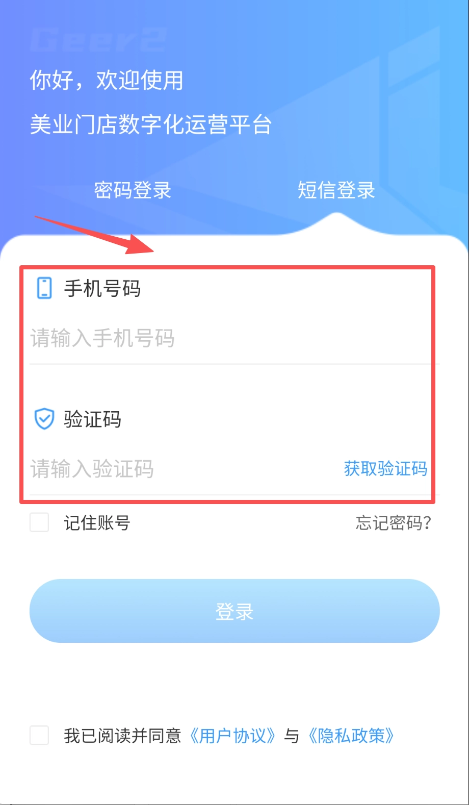 不管选择哪种登录方式,把信息填写完整并勾选同意协议后,点击页面底部那个醒目的蓝色“登录”按钮,就可以成功进入平台着手管理你的美业门店了。