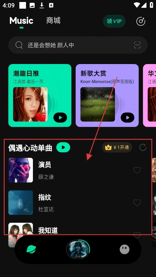 在音乐页面里,找到【偶遇心动单曲】这个板块,里面收录了薛之谦的《演员》等歌曲,赶紧去挑选自己喜欢的来听吧。