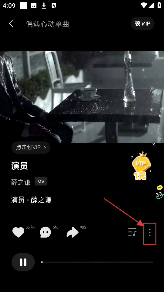 打开【演员】这首歌,进入播放页面后,点击右侧的三点图标,就可以打开更多操作选项啦。