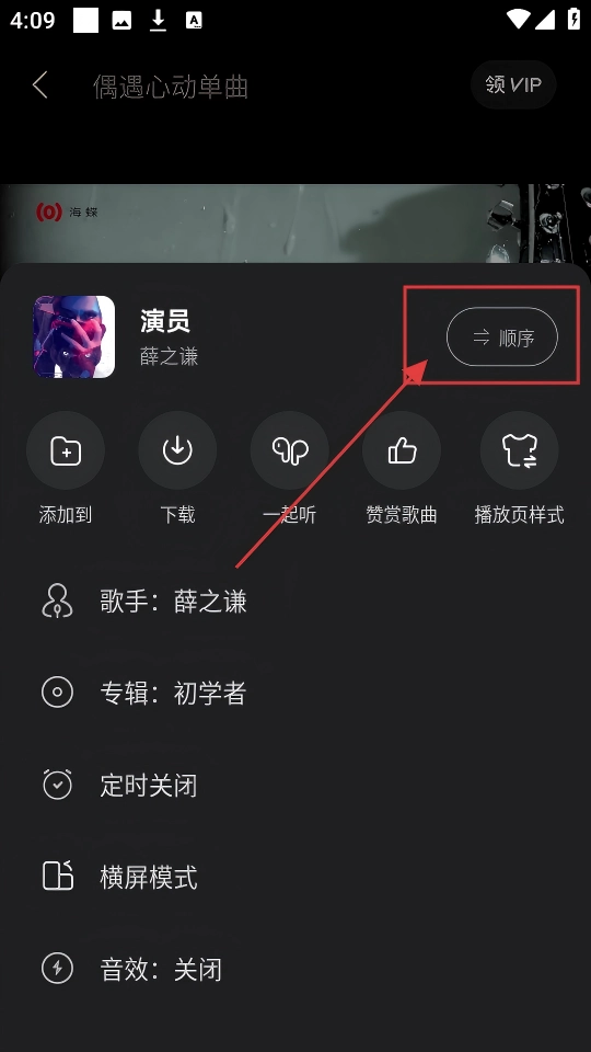 调整播放顺序后,还能切换到【单曲】循环模式,这样就能一直重复听【演员】这首歌啦。