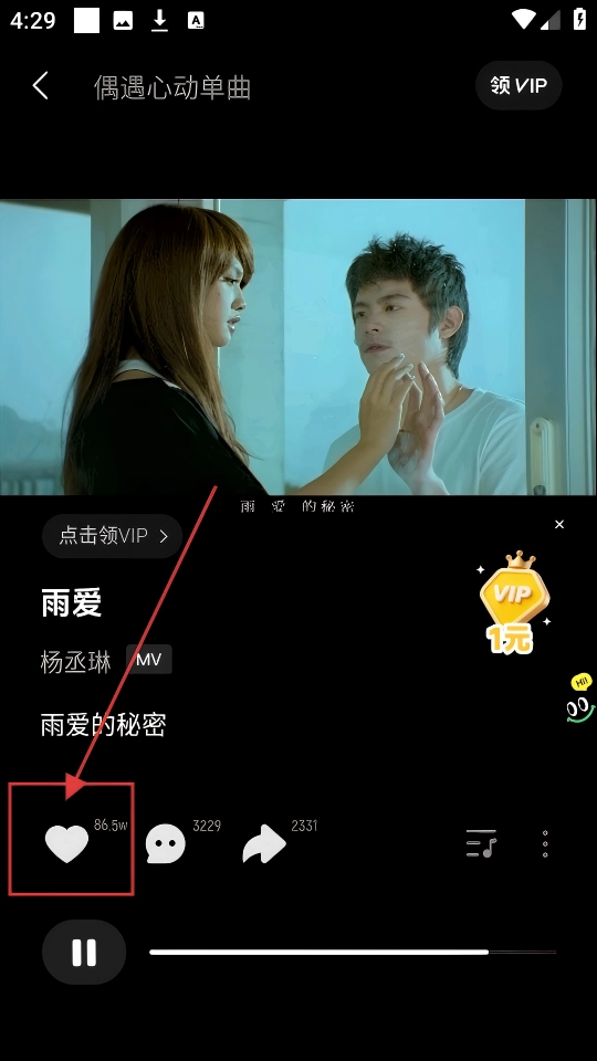 进入【雨爱】的播放页面后,在左侧找到那个心形图标,点击它就可以把这首歌添加到喜欢列表里了。
