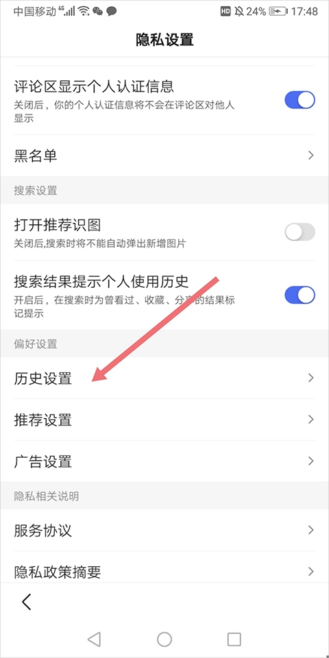 在打开的新页面中点击【历史设置】