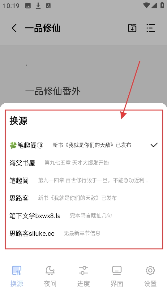 在《一品修仙》的阅读界面,点击“换源”按钮,就能打开换源列表,进而挑选其他小说来源了。