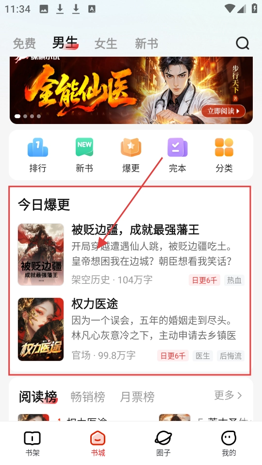 我们打开软件的书城页面后,就能看到“今日爆更”板块下的各类书籍,要是对某本书有兴趣,点击书籍的标题,就能进入它的详情页面了。