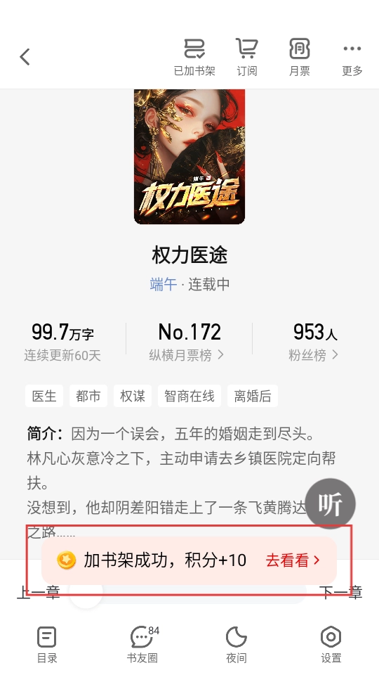 点击后,页面会弹出“加书架成功,积分+10”的提示,这表明书籍已顺利添加至书架,后续查找该书就会更加便捷了。