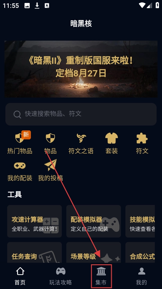 在暗黑核首页,点击【集市】选项,就能进入集市页面,查看各类物品的交易信息了。