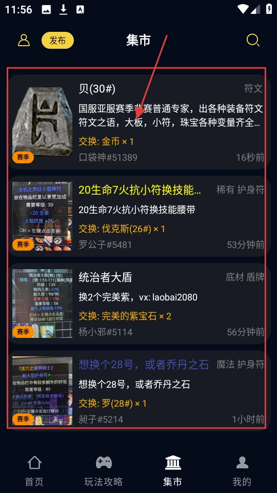进入集市页面后,能看到符文、护身符等各类物品的交易信息,您可以挑选自己感兴趣的物品。