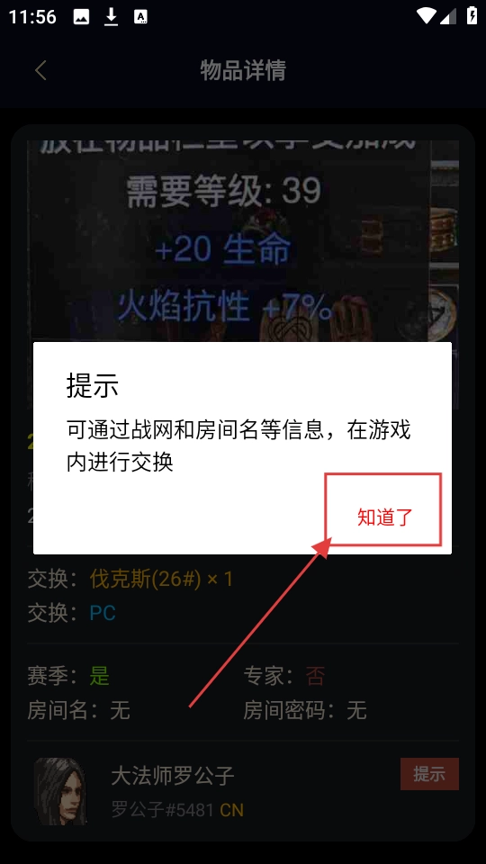 查看提示内容后,点击【知道了】按钮,就能关闭提示弹窗,接着进行物品交易的相关操作啦。