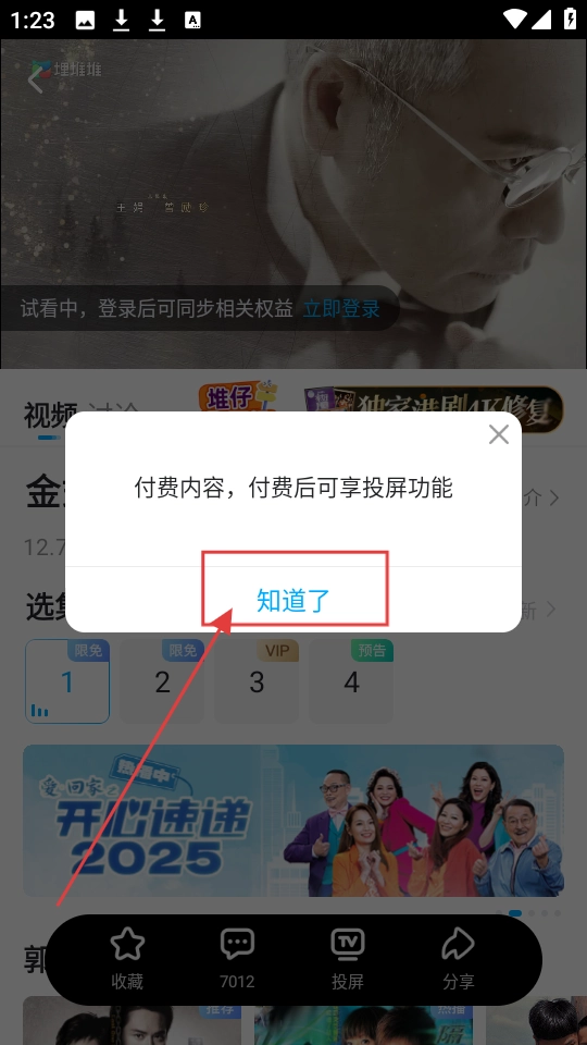 若投屏功能需要付费,系统会弹出提示框,点击【知道了】按钮,就能关闭提示框了。