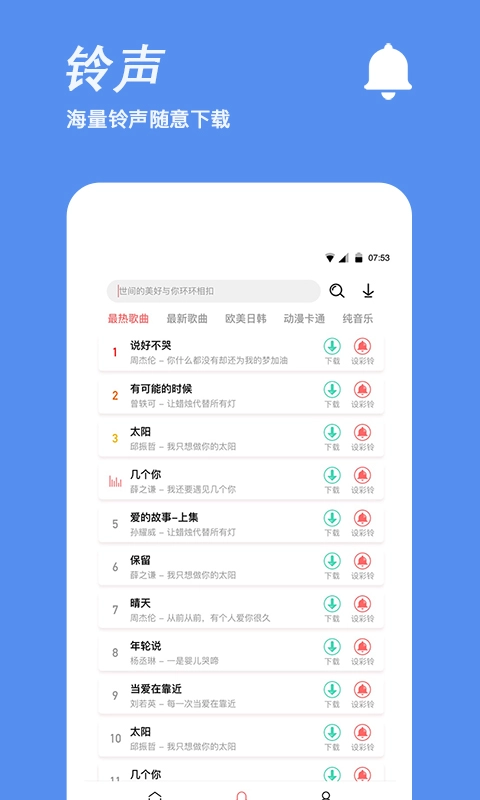 2、种类齐全:海量手机铃声,提供搜索热词榜,最热歌曲、最新歌曲、欧美日韩、影视、动漫卡通、应有尽有。