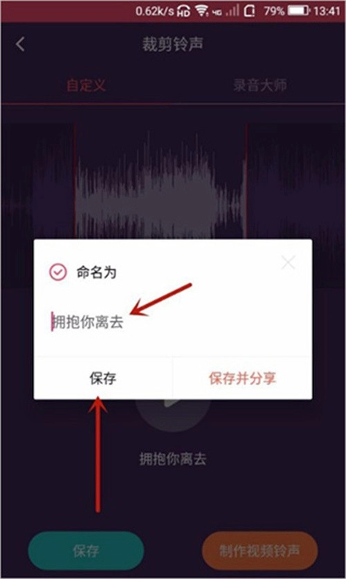 4、这时候会出现一个“命名为”,将裁剪好的音乐取一个名称,然后点击一下“保存”如图所示;