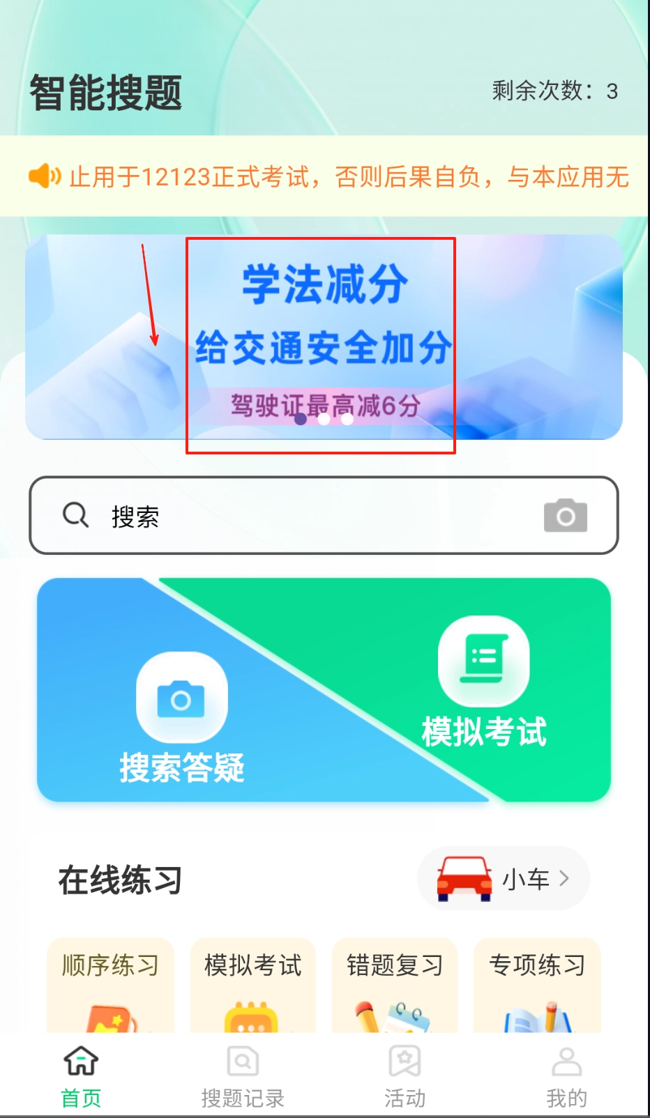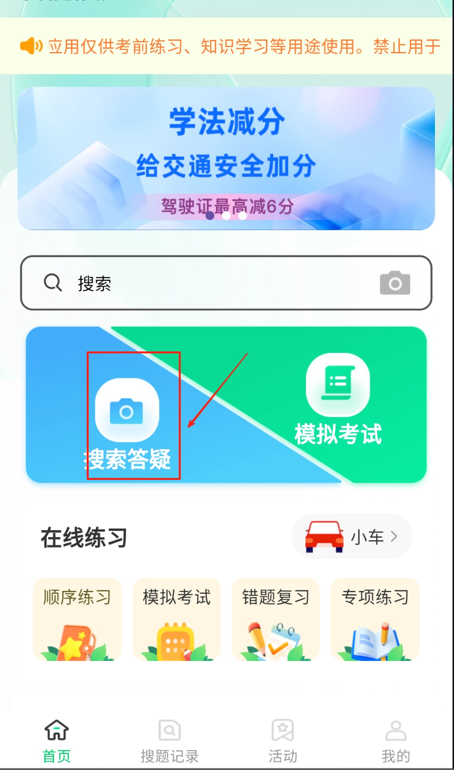 进入应用首页后,就能看到学法减分的基础知识板块,建议先对核心考点内容进行系统学习。