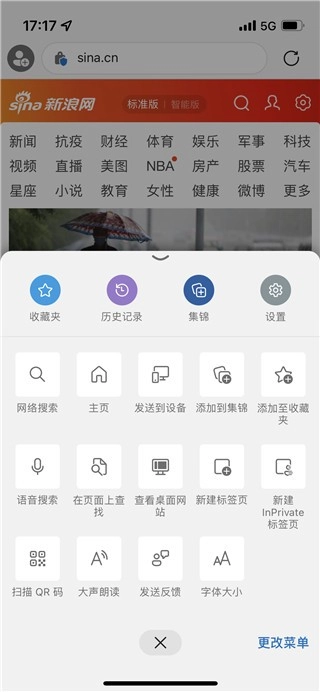 比如下图一中的收藏夹、历史记录等,此外网上滑动还可以看到更加全面的工具,其中就有“大声朗读”这一项;