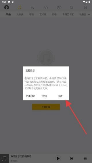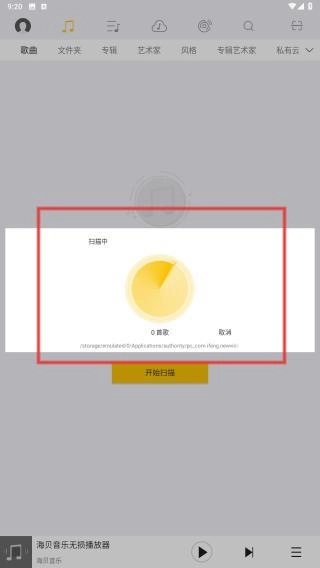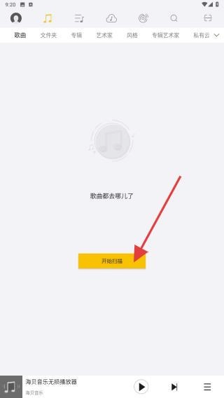 2、进入音乐界面,点击黄色字眼的“开始扫描”。