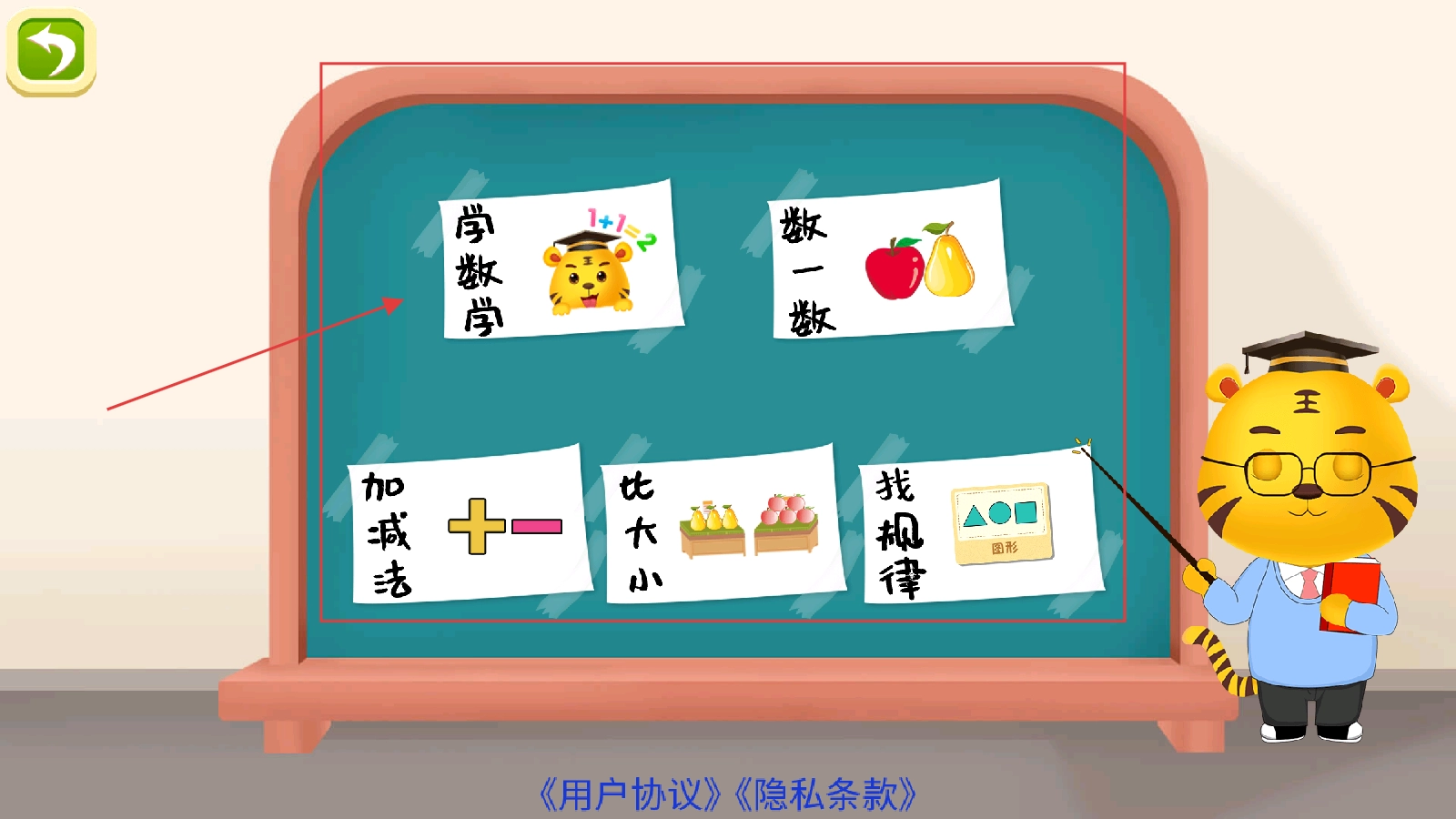 打开应用程序后进入主界面,能看到包含【学数学】【学汉字】【学动物】在内的多个学习板块,随后点击【学数学】板块。