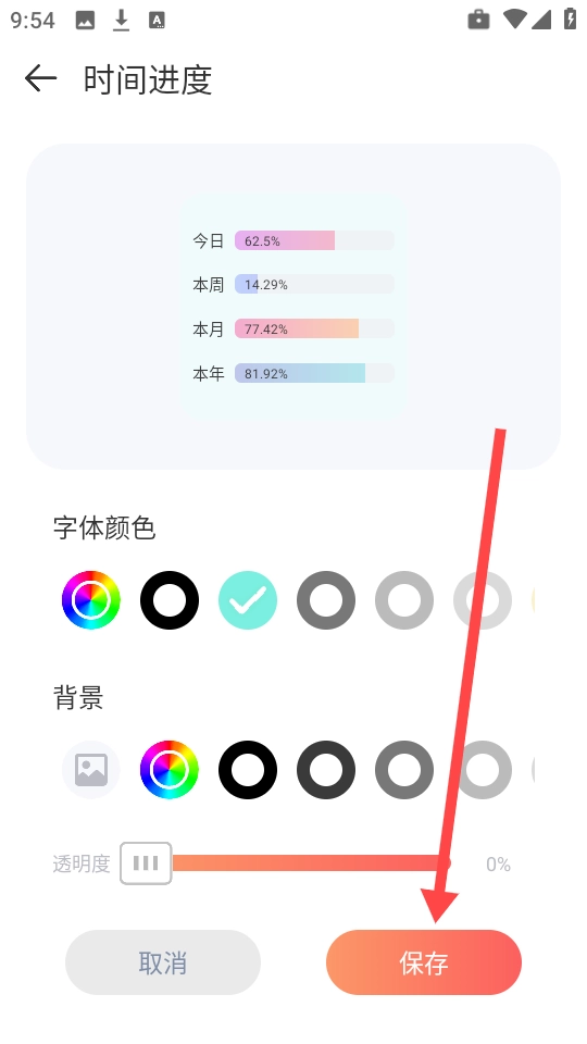 3、对字体颜色、背景颜色以及透明度进行调整,各项设置完成后点击“保存”按钮。