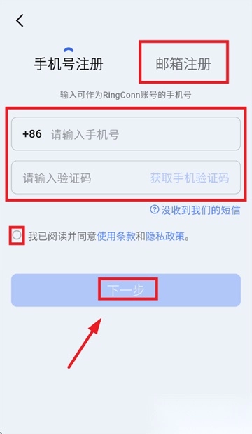 输入手机号与验证码,勾选同意用户协议和隐私政策,点击下一步完成注册;也可选择邮箱注册方式,通过电子邮箱创建新账户。