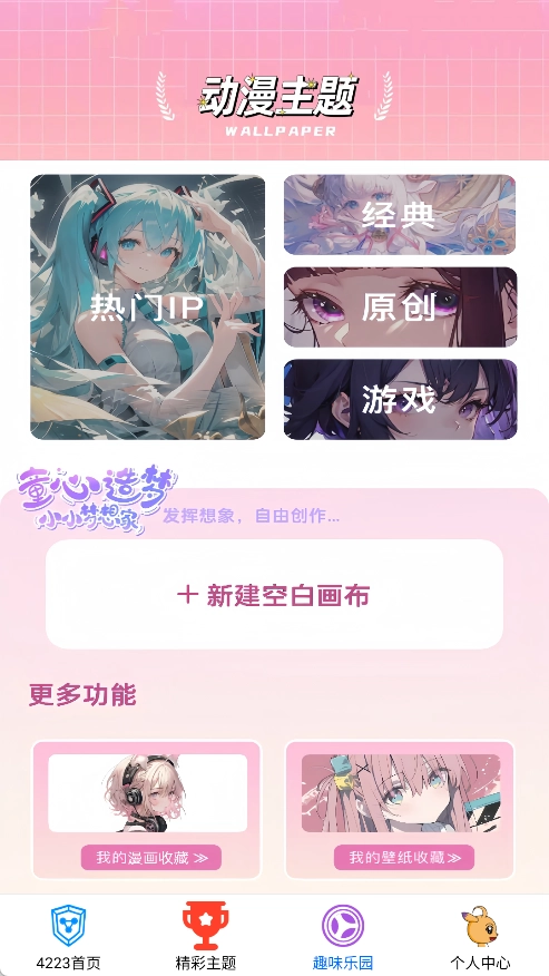 趣味乐园里设有不少不同的动漫主题,而且能够快速新建空白画布。