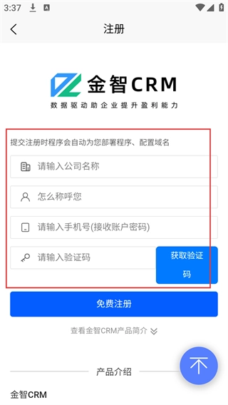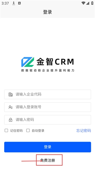 2、在登录页面点击底部的【免费注册】选项,跳转至金智CRM的注册页面。