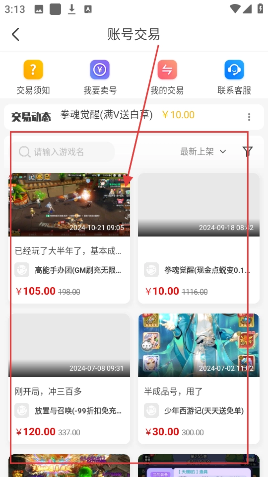 进入个人页面后,点击【账号交易】选项,就能进入账号交易页面,查看可以进行交易的游戏账号啦。