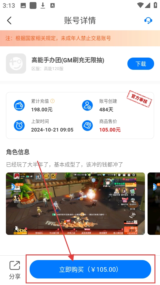 进入账号详情页面后,点击【立即购买(¥105.00)】按钮,就能开展账号购买流程,操作完成后您就可以获得这个账号了。