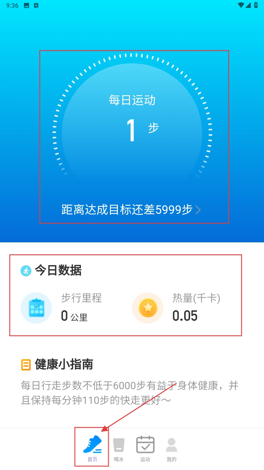 打开应用后,先在【首页】查看每日运动步数以及今日的步行里程、热量等数据,接着进入健康数据的浏览操作环节。
