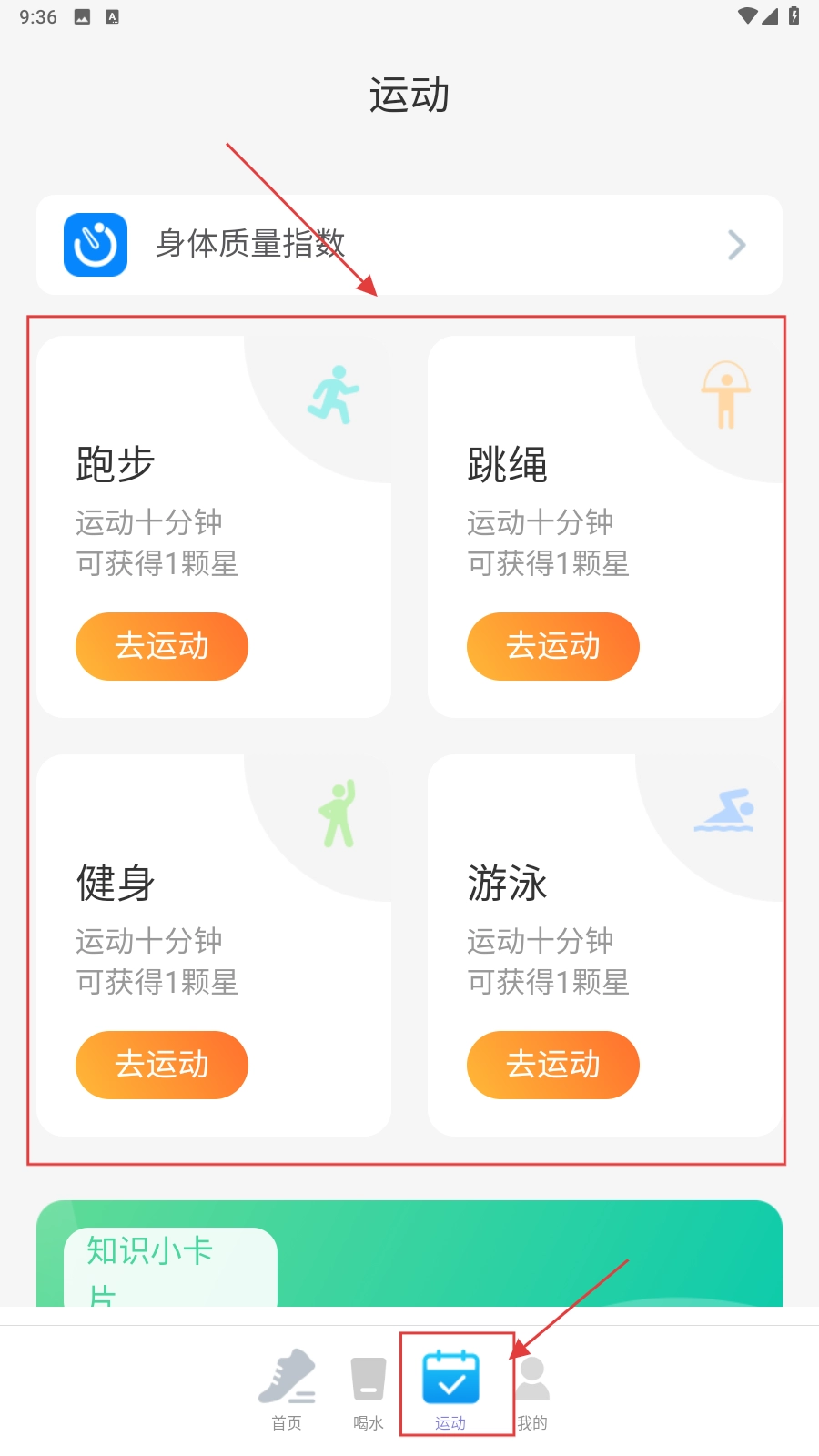进入【运动】板块后,选择跑步、跳绳等具体的运动项目,接着点击【去运动】按钮,这样就完成了运动计划的选择任务。