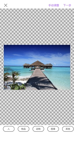 若用户选择AI抠图功能,在导入图片后,需点击界面下方呈现的“人”“物品”“动物”“图章”“其他”“室内”“室外”等选项,以此选定图片中待抠选的主体。