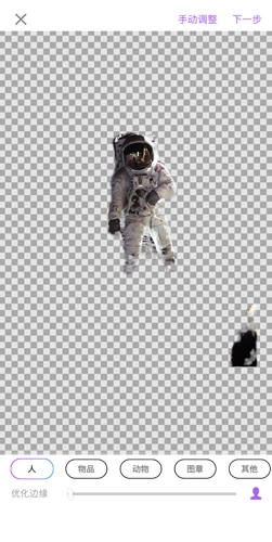 选择完成后,系统会自动抠出主体,接着我们拖动下方的优化边缘滑块,就能对锯齿部分进行优化。要是还有未抠选的位置,点击右上角的手动调整进行手动操作就可以了。