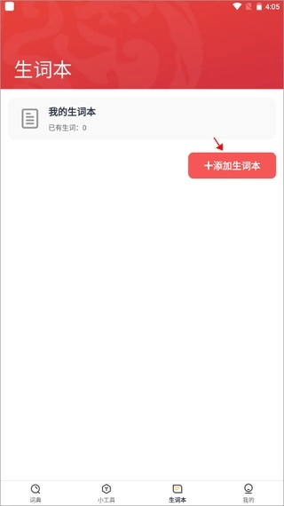 1、先切换到“生词本”页面,接着点击页面右上方的“添加生词本”按钮;