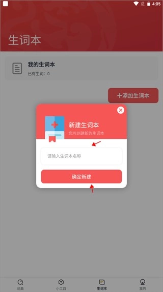2、给新建的生词本拟定一个简洁明了的名称,点击“确定新建”按钮即可完成创建操作。