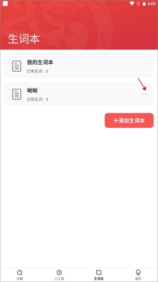 3、创建成功后,点击生词本右侧的三点图标,就能执行编辑、删除等操作。