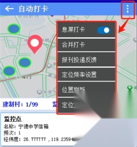 在【自动打卡】界面右上角,点击“┇”按钮弹出六个选项: