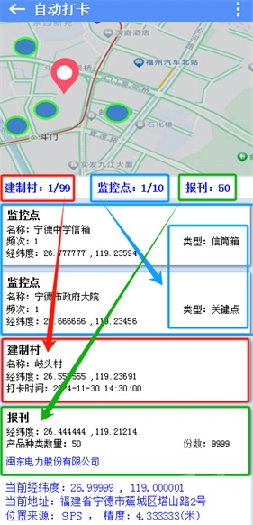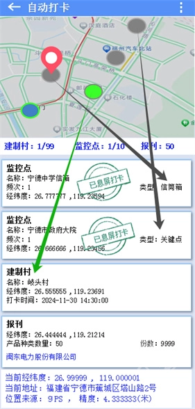 1、“息屏打卡”开关:开启后,设备息屏可自动打卡,显示“息屏打卡,定位服务运行中”。打卡成功,监控点和建制村状态变为“已息屏打卡”,蓝色圆圈变灰色,报刊数据自动消失,点击未打卡数据范围变绿。