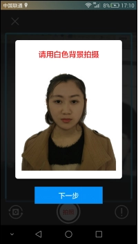 第一步:拍摄免冠一寸照时,需用手机前置摄像头进行近景拍摄。照片要求免冠、不戴围巾,头像清晰,背景为白色,脸部无遮挡。若拍摄后照片不清晰,可返回重新拍摄。