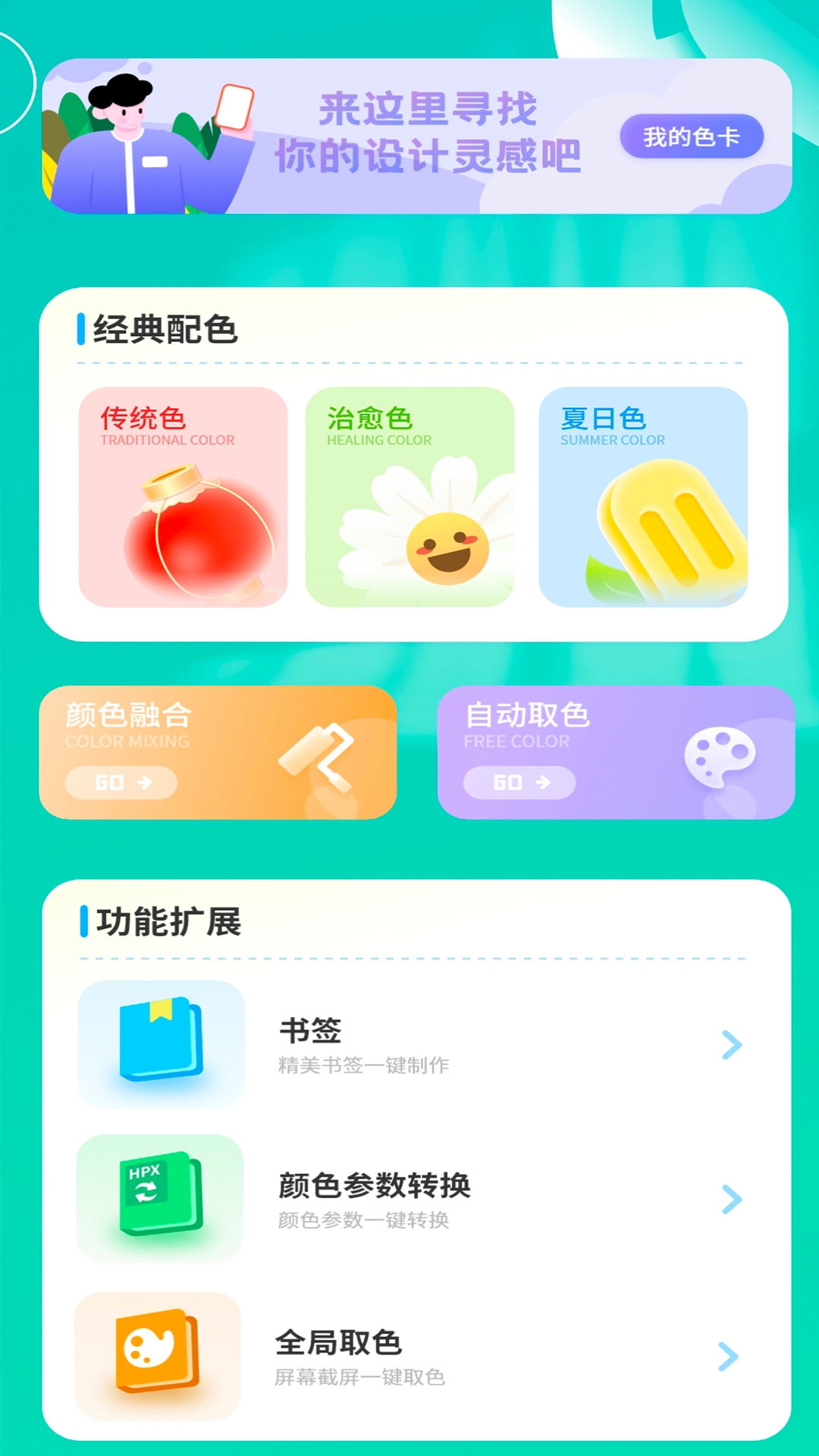为设计新手提供灵感参考,我们准备了传统色、夏日色、治愈色等经典配色方案,还搭配了自动取色功能。
