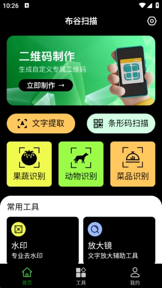打开该软件,用户能够开展二维码制作、文字提取、条形码扫描、果蔬识别、动物识别和菜品识别等操作,并且软件还配备了各类常用工具。